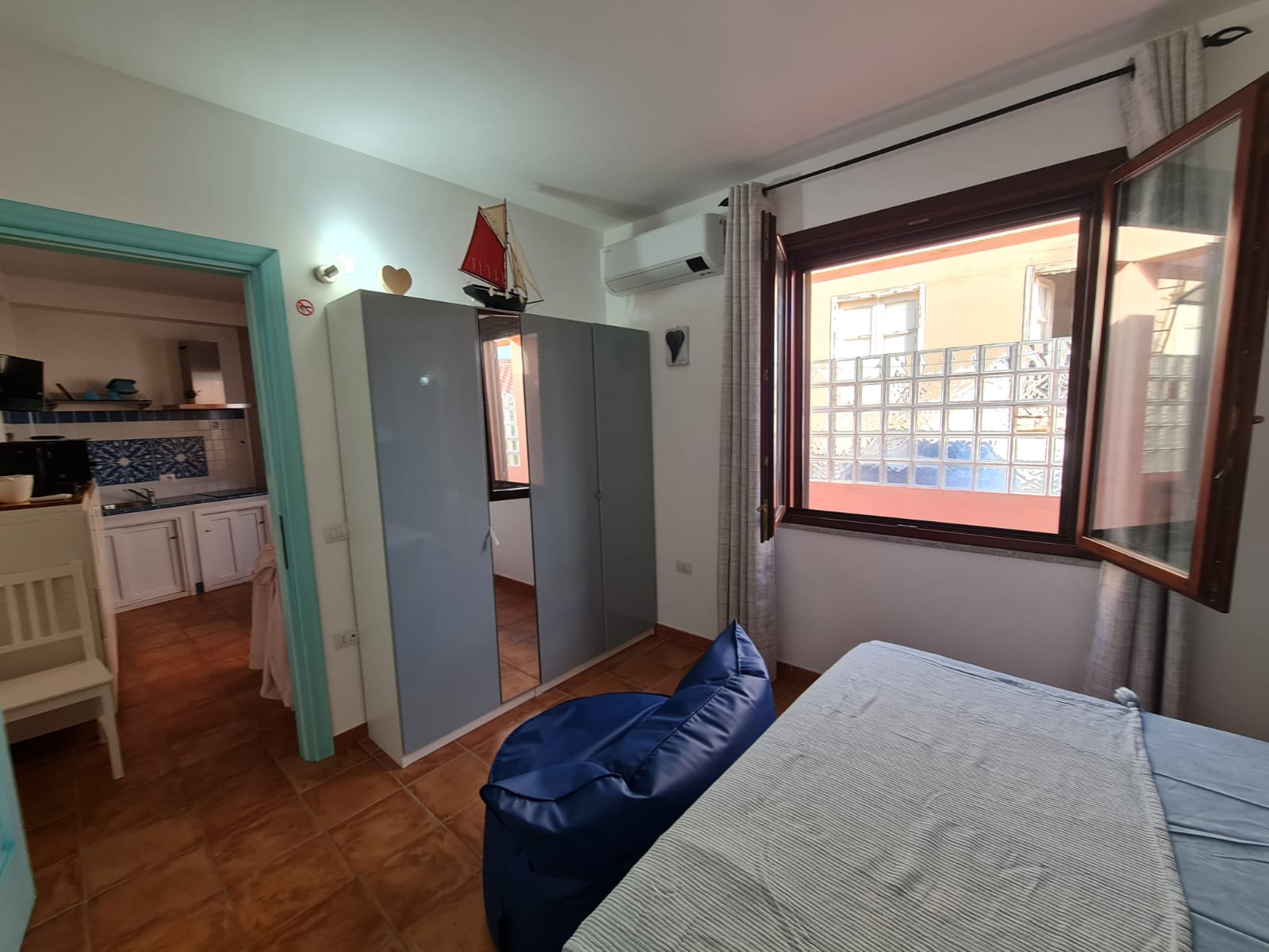 Il primo appartamento offre un’ampia camera matrimoniale con un grande armadio e specchio.