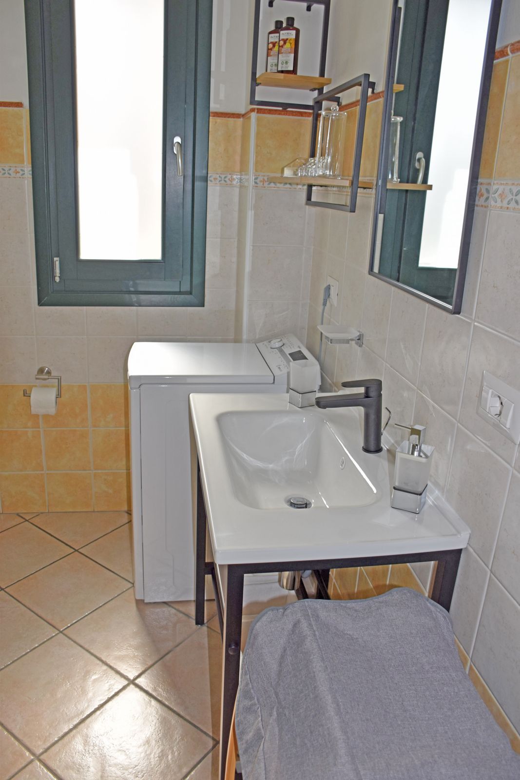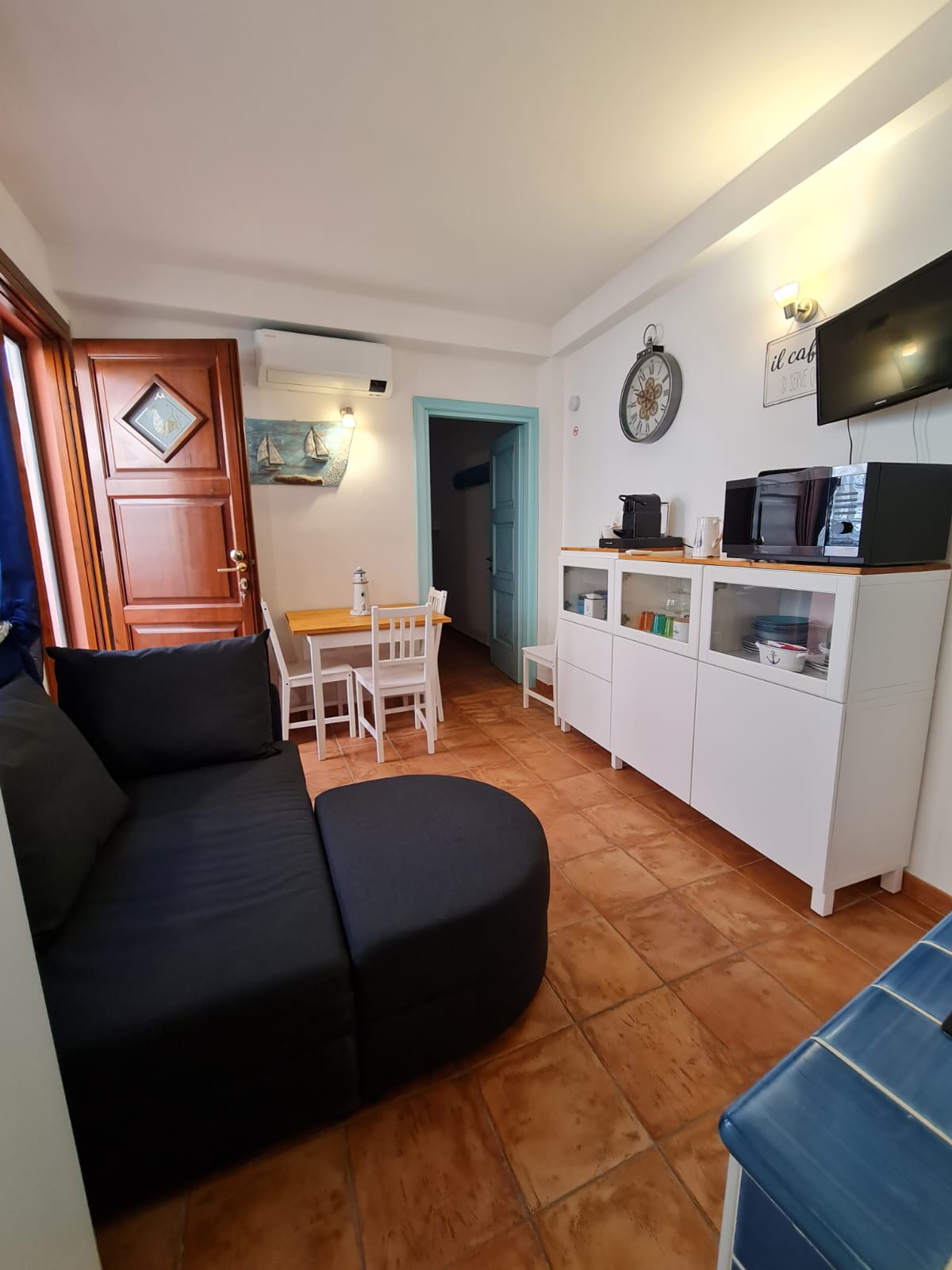 L’ingresso di ciascun appartamento si apre direttamente sul soggiorno con angolo cottura, ambienti luminosi grazie alle ampie finestre. Ogni soggiorno è arredato con divano, smart monitor e wifi. La cucina è dotata di piastra a induzione, forno a microonde, macchina per il caffè espresso, stoviglie, pentole e una scopa elettrica. Tutte le stanze sono climatizzate (caldo/freddo) e le finestre sono dotate di zanzariere. Il bagno è completo di comodo box doccia, lavatrice, scarpiera e phon.