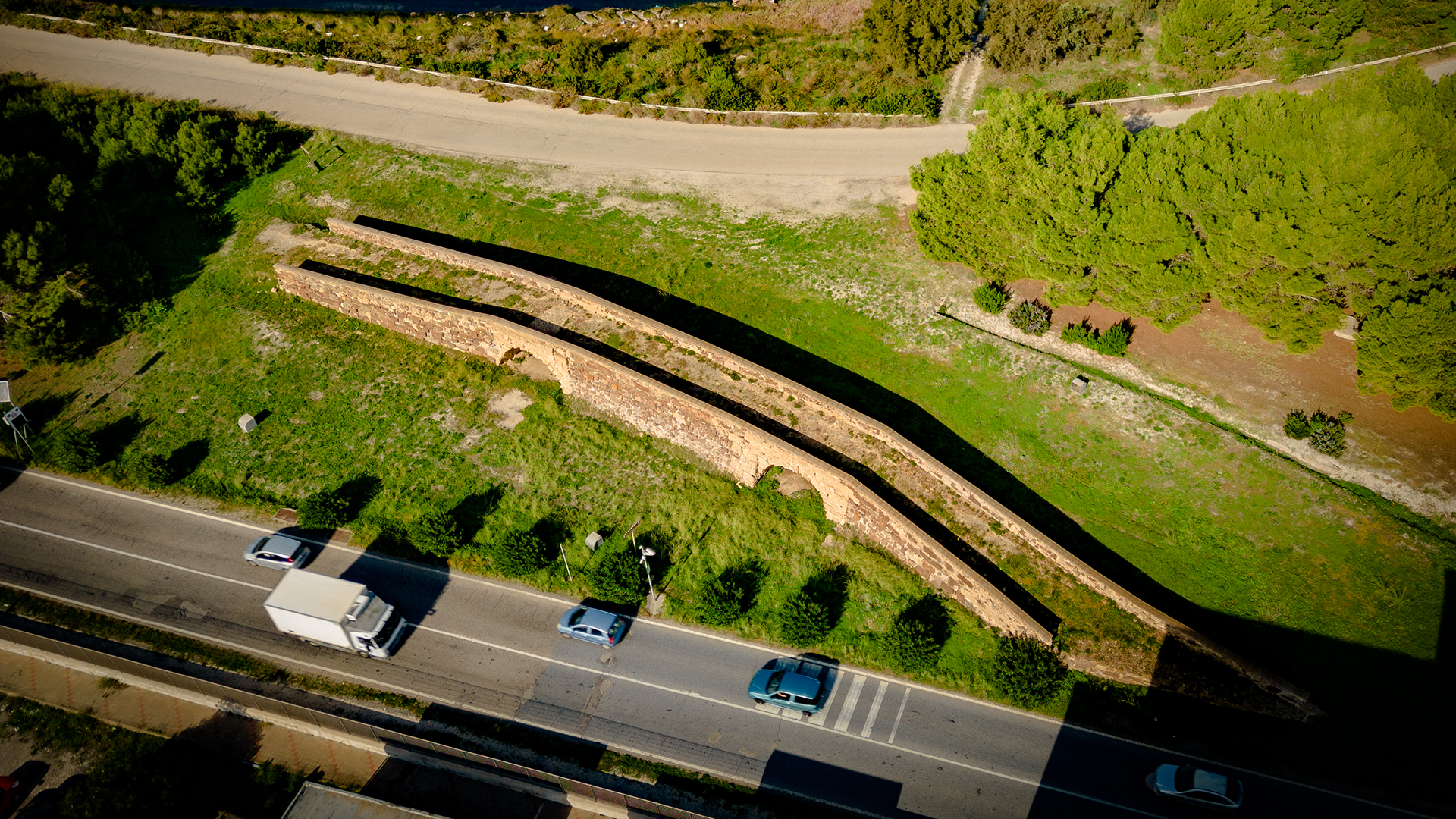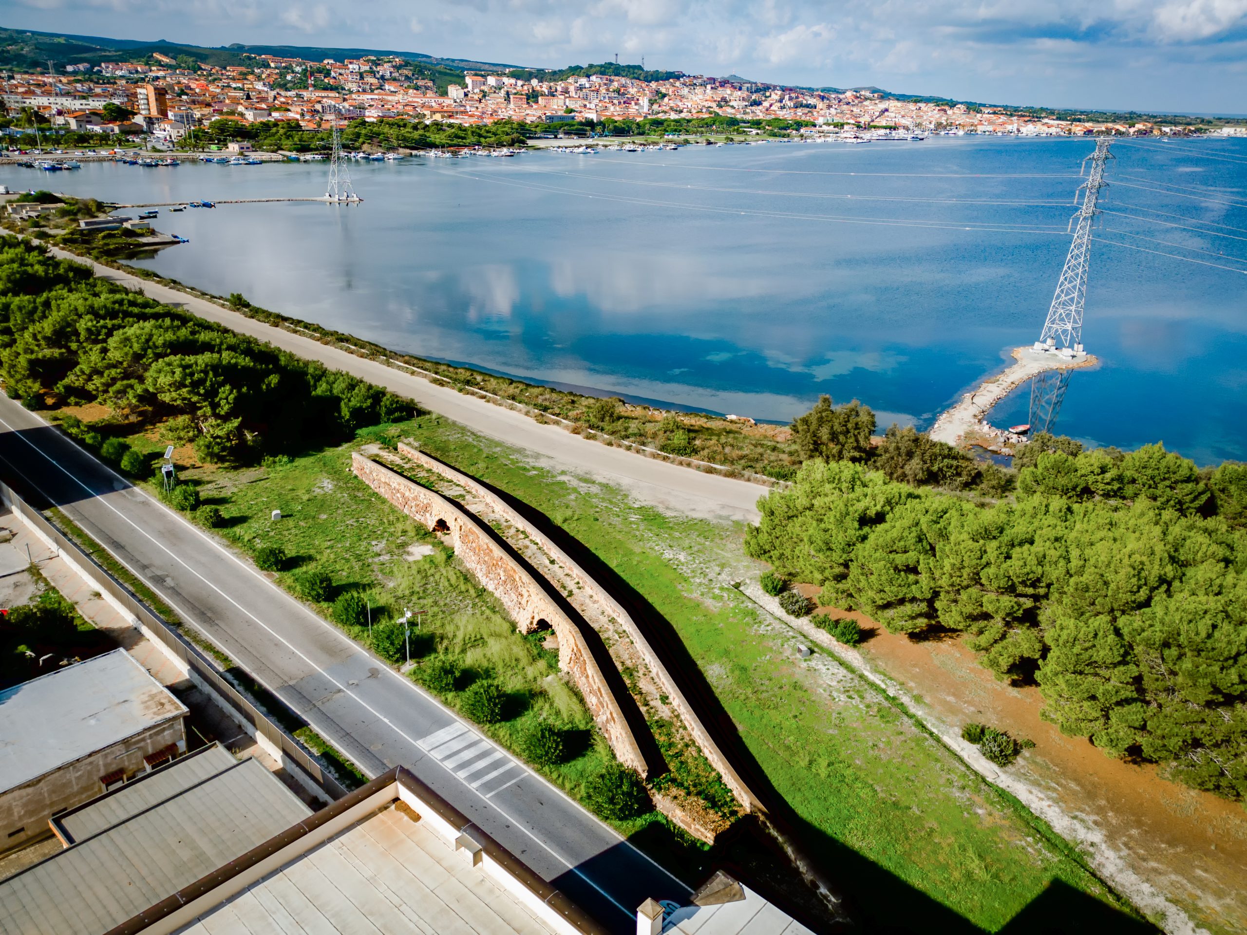 Questa maestosa opera era parte integrante della strada romana che univa Karalis, l’antica Cagliari, e Sulci, che nel suo ultimo tratto verso quest’ultima si snodava con un sistema di ponti e strade lastricate attraversando la zona dello Stagno di Santa Caterina e i suoi isolotti. Oggi, rimane visibile ancora un breve tratto dell’originale strada romana, parzialmente sommersa ma ben visibile nelle giornate di bassa marea.