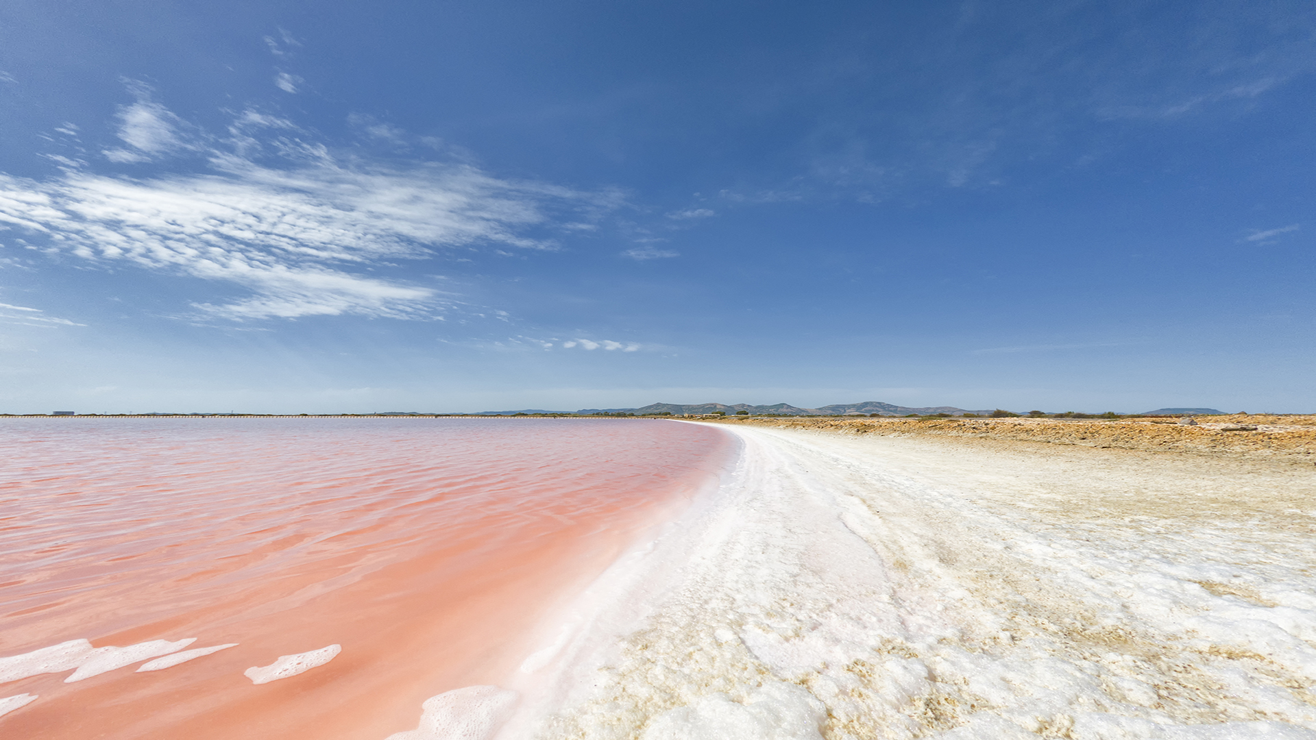 Un luogo unico e suggestivo, stradelli che si diramano tra distese d’acqua rosa e blu, cumuli di sala bianchi rievocano paesaggi lunari.
